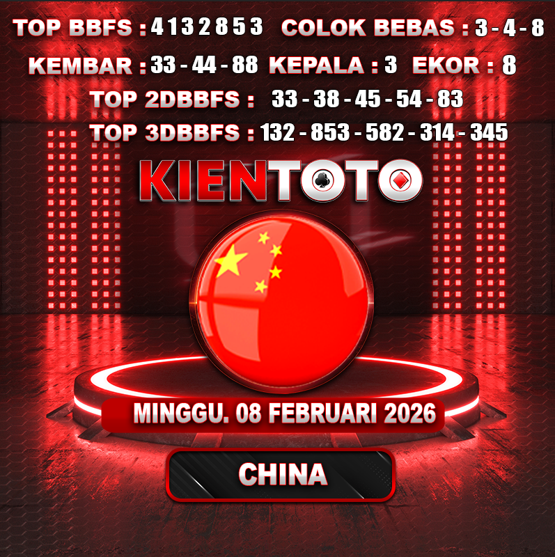 PREDIKSI TOGEL CHINA 08 FEBRUARI 2026 Selamat Datang dan Selamat Bergabung di Situs Prediksi Togel Online. Permainan Togel Online saat ini telah menarik banyak perhatian para bettor di Indonesia. Jika dulunya Anda harus menikmati permainan togel melalui bandar togel darat, maka sekarang ini Anda hanya perlu mempercayakan KIENTOTO sebagai Bandar Togel Online Resmi dan Terpercaya. Melihat semakin tingginya minat para pecinta togel online, kami menyediakan Situs Prediksi Togel Online dan Bocoran Togel Jitu yang bisa Anda jadikan sebagai acuan sebelum melakukan pemasangan angka togel.