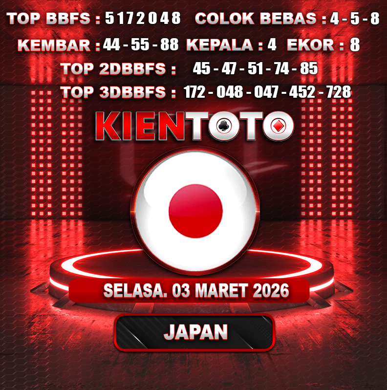 PREDIKSI TOGEL JAPAN 03 MARET 2026 Selamat Datang dan Selamat Bergabung di Situs Prediksi Togel Online. Permainan Togel Online saat ini telah menarik banyak perhatian para bettor di Indonesia. Jika dulunya Anda harus menikmati permainan togel melalui bandar togel darat, maka sekarang ini Anda hanya perlu mempercayakan KIENTOTO sebagai Bandar Togel Online Resmi dan Terpercaya. Melihat semakin tingginya minat para pecinta togel online, kami menyediakan Situs Prediksi Togel Online dan Bocoran Togel Jitu yang bisa Anda jadikan sebagai acuan sebelum melakukan pemasangan angka togel.